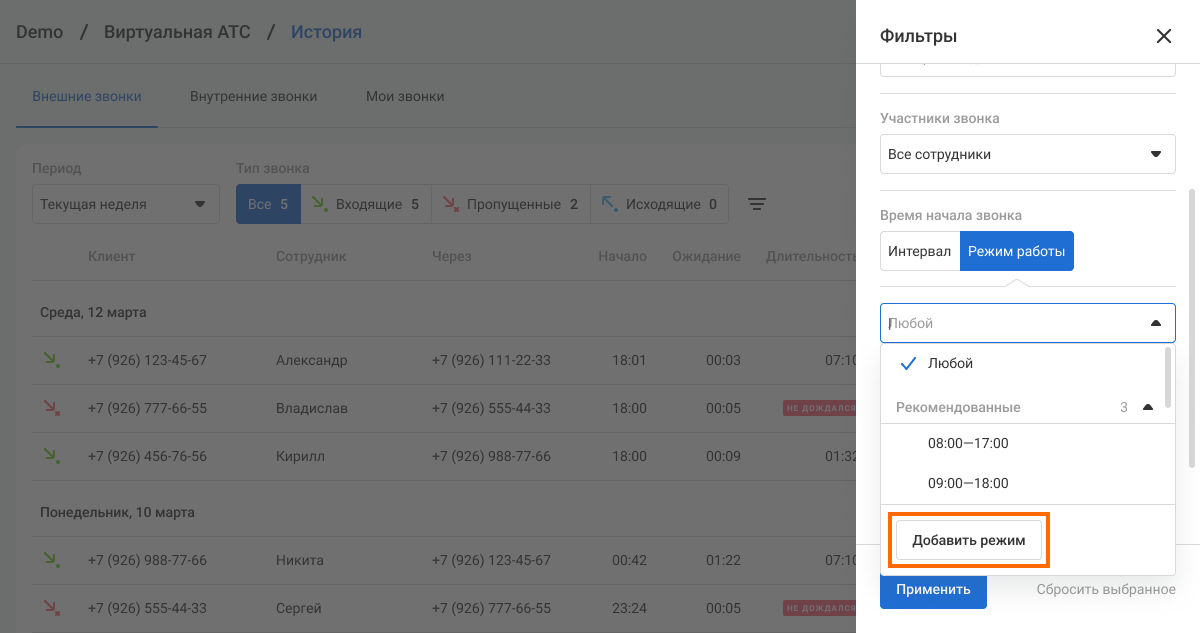 После настройки фильтра нажмите «Применить» внизу боковой панели с фильтрами. В Истории будут показаны звонки, которые начались во время выбранного режима работы.