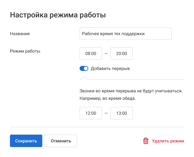 Также можно указать перерыв на обед. Для этого передвиньте вправо переключатель «Добавить перерыв» и укажите нужный интервал. Тогда при использовании фильтра фильтра «Время начала звонка» в Истории не будут показываться звонки, начавшиеся во время перерыва.