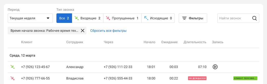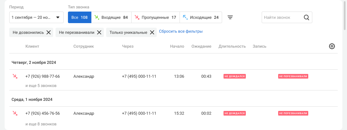 Благодаря фильтру «Контроль пропущенных» вы сможете легко найти непринятые звонки, на которые сотрудники не перезванивали или не дозвонились.
