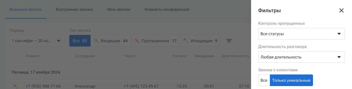 Фильтр «Контроль пропущенных» отображается в панели фильтров, когда выбраны типы звонков «Все», «Входящие» или «Пропущенные». При выборе типа звонков «Исходящие» фильтр «Контроль пропущенных» недоступен.