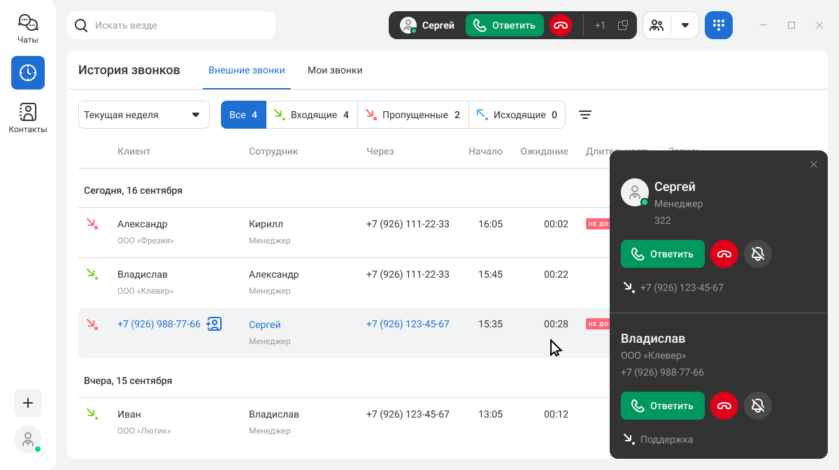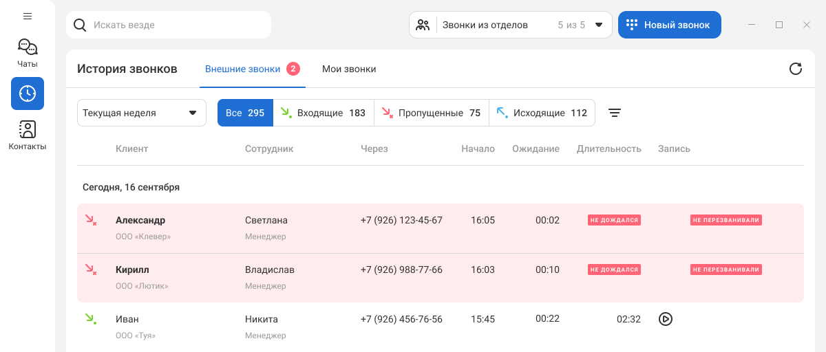 Чтобы не терять пропущенные, их число отображается в боковом меню и на вкладках в истории звонков. Здесь вы сможете узнать больше о контакте и быстро ему перезвонить. Гибкая система фильтров помогает найти любой звонок в архиве и при необходимости прослушать его запись.