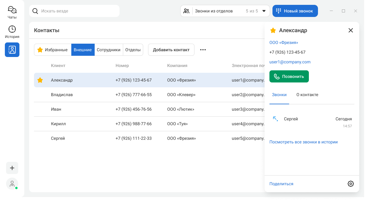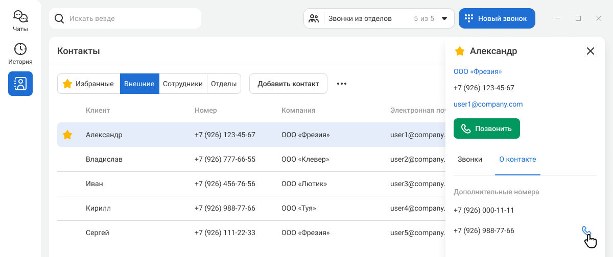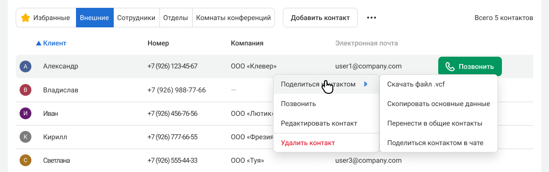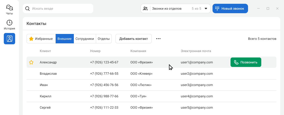 В Корпоративном мессенджере отображаются контакты клиентов и сотрудников. При регистрации сотрудника в АТС его контакт автоматически появляется у всех коллег. Контакты клиентов можно добавлять в мессенджер напрямую, они также доступны всем сотрудникам и синхронизируются с АТС.