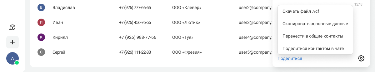 • Скачать файл .vcf — электронный формат визитных карточек, в котором будут сохранены все поля из карточки контакта.