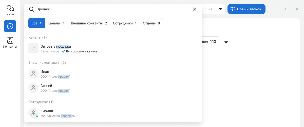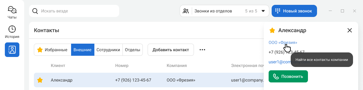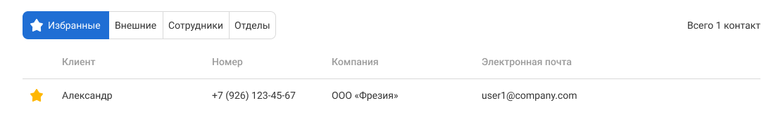 Чтобы найти нужный контакт, в поисковой строке начните писать значение одного из полей: имя, номер, e-mail контакта или название компании.