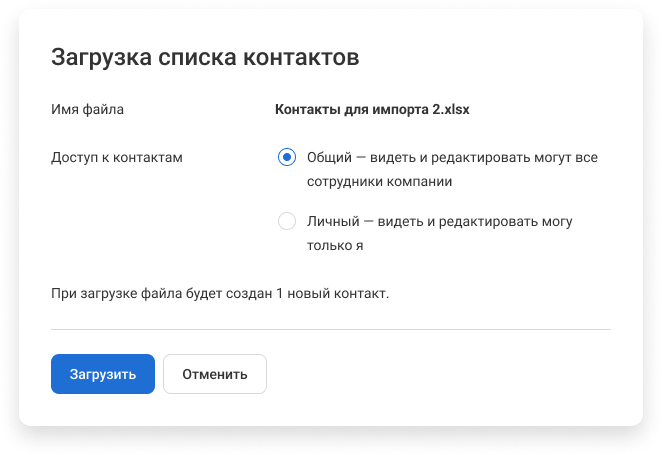 6. Подтвердите загрузку списка контактов, кликнув на кнопку «Загрузить».