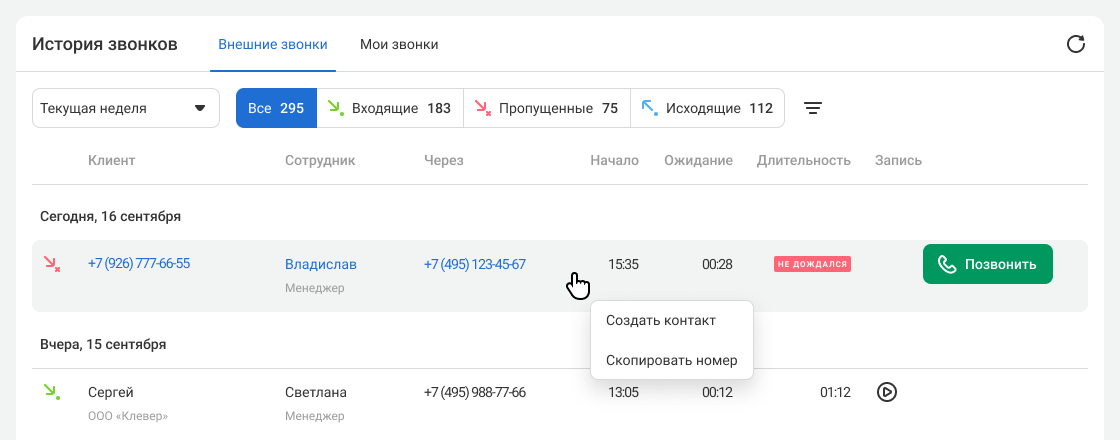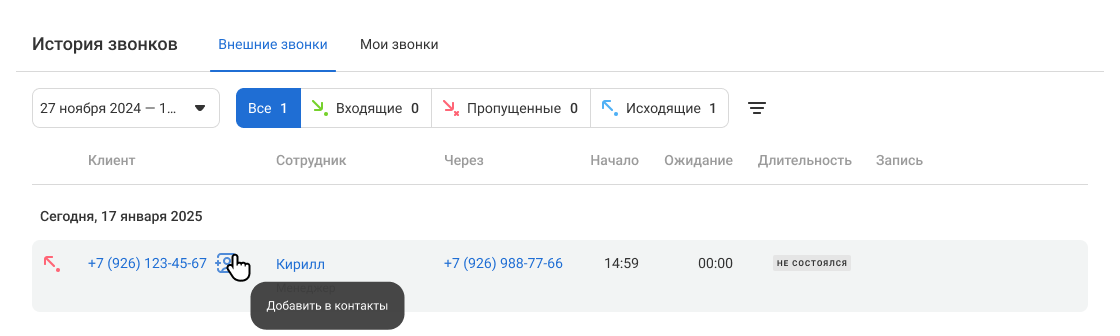 После заполнения данных о клиенте нажмите «Сохранить». Все звонки сохраненного контакта будут автоматически проименованы — его имя будет отображаться в истории.