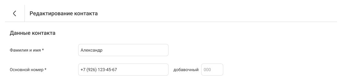 Введите основные данные о клиенте: ФИО, дополнительные телефонные номера, электронную почту, название компании. Также укажите, кто должен видеть этот контакт — только вы или все пользователи АТС.