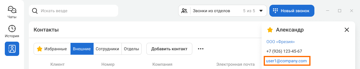 Чтобы ускорить процесс отправки e-mail контакту из АТС, нажмите на адрес электронной почты контакта в его карточке.