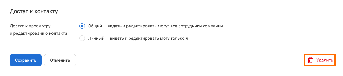 Чтобы удалить созданный вами контакт, в окне редактирования контакта в правом нижнем углу нажмите «Удалить».