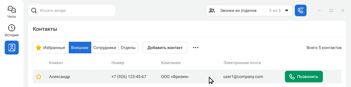 Контакты коллег — всегда под рукой. Контакты сотрудников и отделов располагаются на соответствующих вкладках, остальные контакты — на вкладке «Внешние».