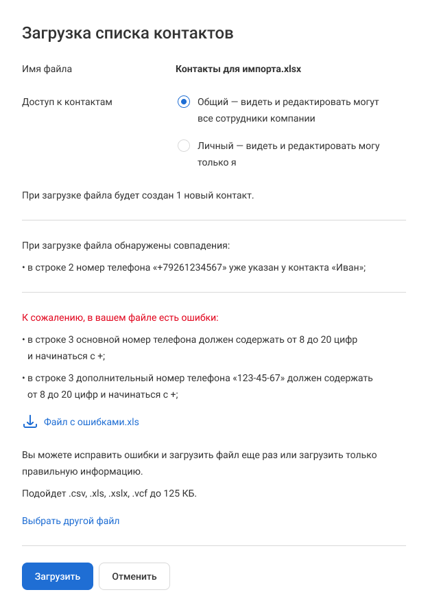 При загрузке xsl-файла с контактами может возникнуть два типа ошибок: