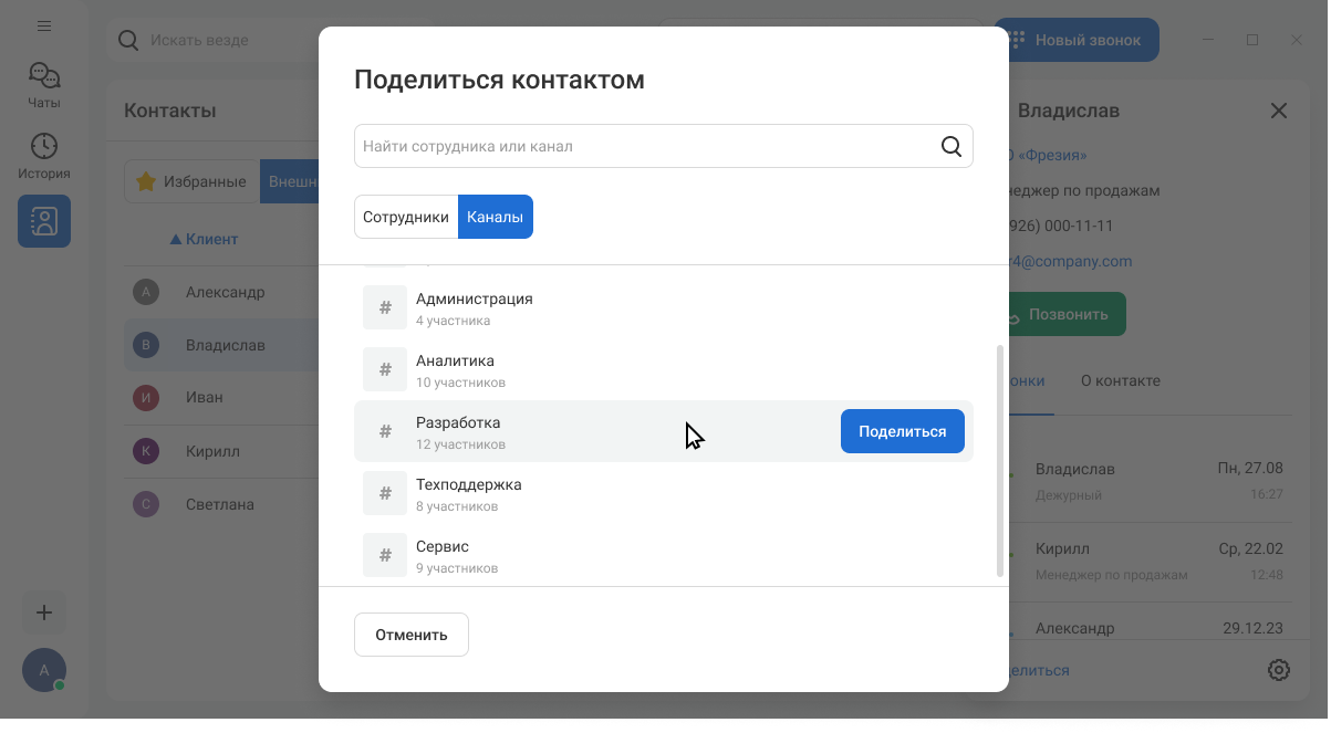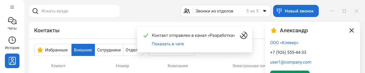 • Поделиться контактом в чате — в чате отобразится краткая карточка контакта с кнопками вызова и отправки сообщения (если это внутренний контакт).