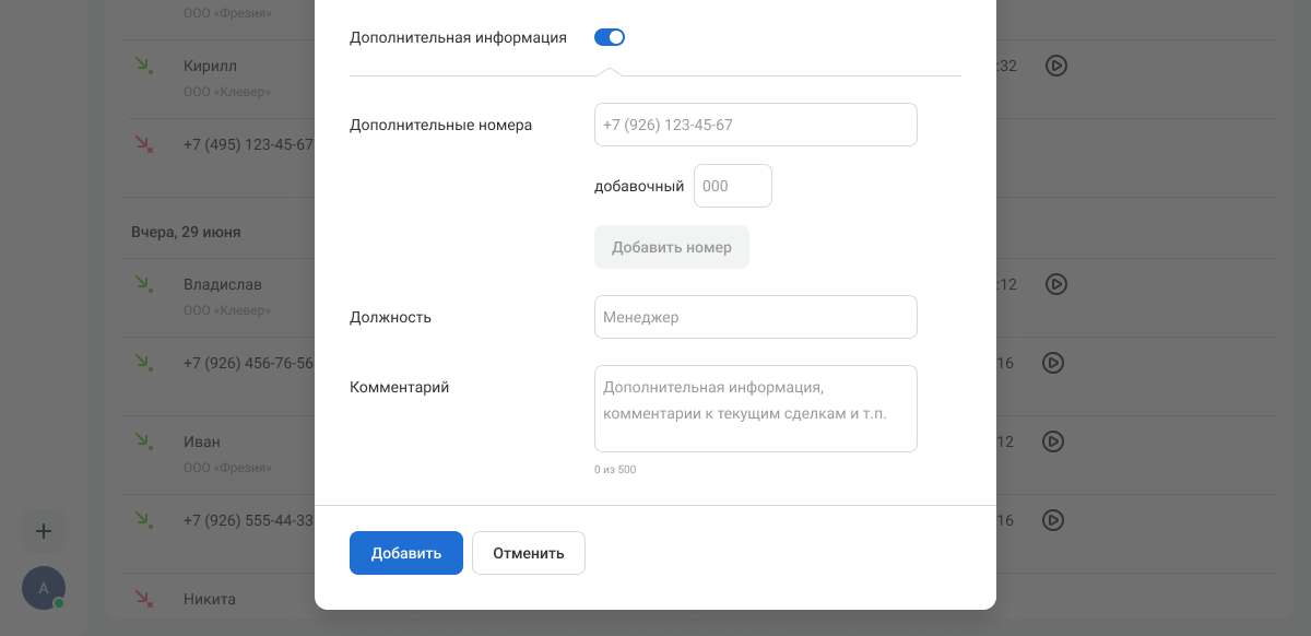 Если вы знаете дополнительный номер клиента, его должность или хотите добавить другие дополнительные сведения, нажмите на переключатель «Дополнительная информация» и заполните поля ниже.