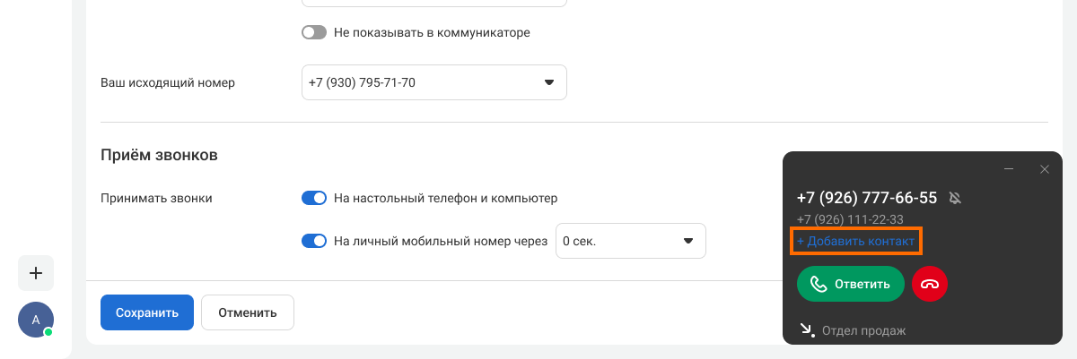 Если вы созваниваетесь с тем, кого нет у вас в контактах, и хотите добавить контакт, не дожидаясь окончания звонка, то в карточке звонка нажмите на кнопку «Добавить контакт».