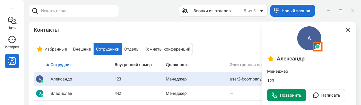Чтобы узнать, доступен ли коллега для оперативной связи, обратите внимание на статус его присутствия в мессенджере. Этот статус отображается в карточке сотрудника, также его можно посмотреть в списке чатов.