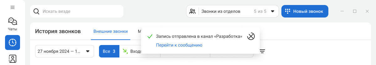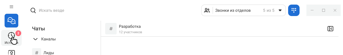 На иконке истории в боковом меню отображается общее число пропущенных звонков, как личных, так и по вашему отделу.