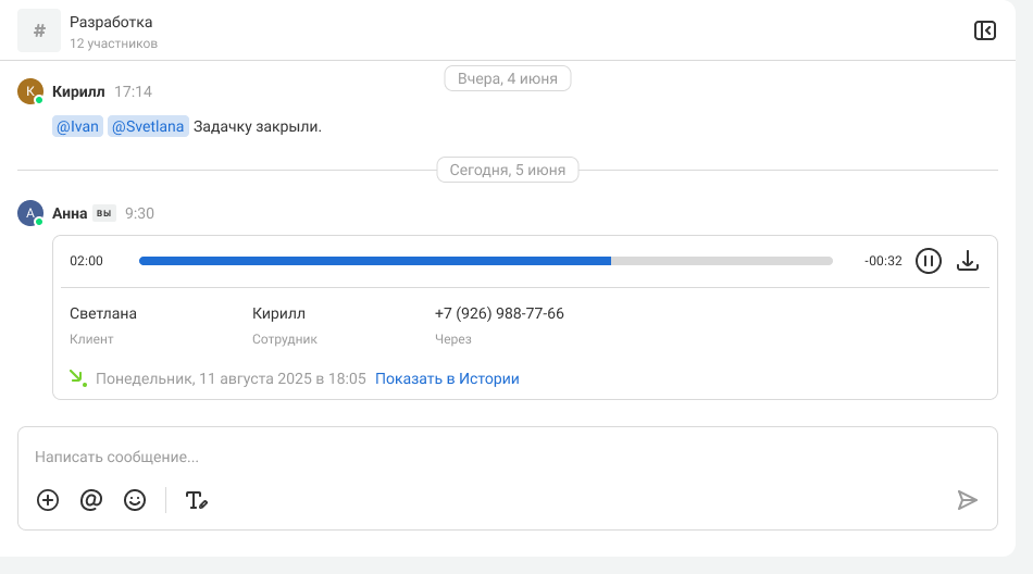 Чтобы поделиться записью звонка в чате, в проигрывателе нажмите на иконку ссылки в правом нижнем углу.