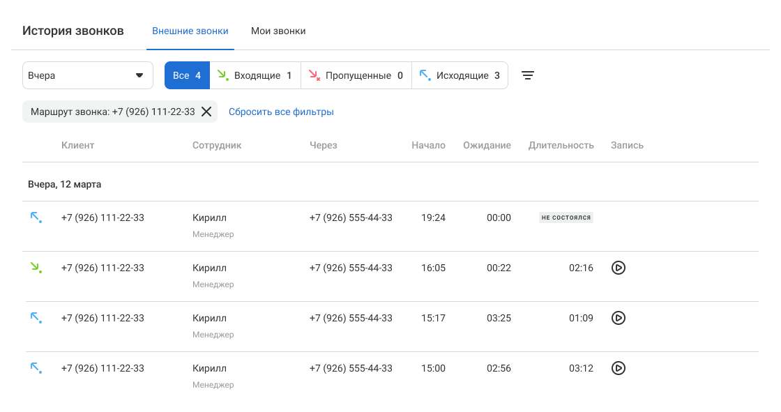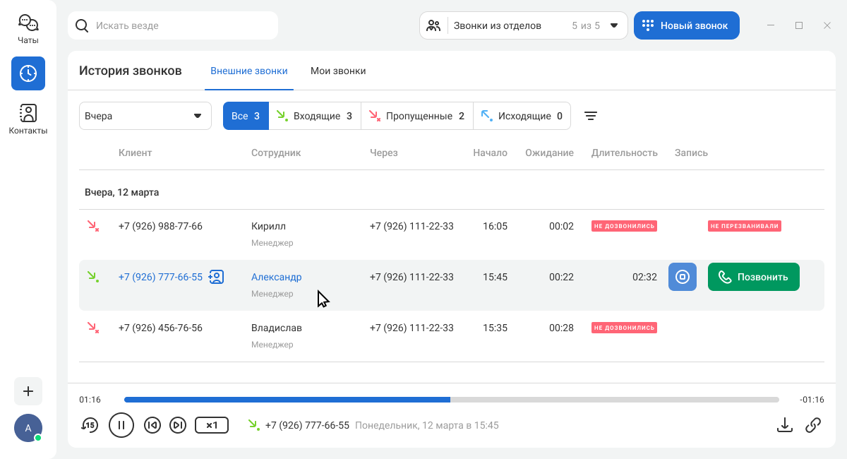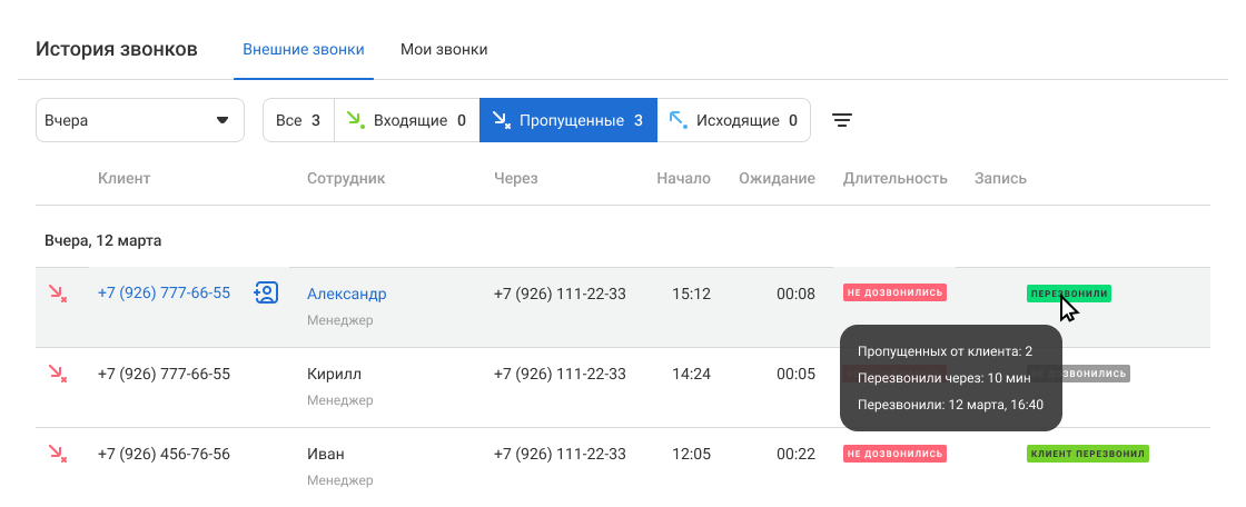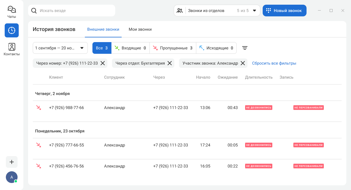 Благодаря фильтру «Контроль пропущенных» вы сможете легко найти непринятые звонки, на которые сотрудники не перезванивали или не дозвонились.