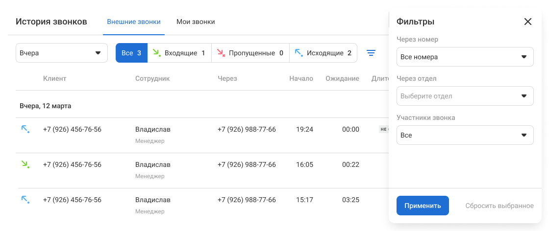 Выберите нужные вам значения фильтров и нажмите «Применить». В таблице останутся только те звонки, которые соответствуют заданным параметрам.