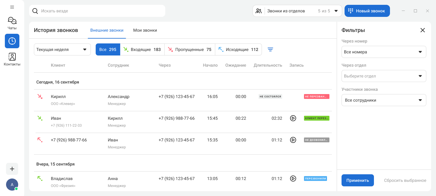 • фильтровать звонки по номерам, отделам, сотрудникам, клиентам и типам вызовов за нужный период;