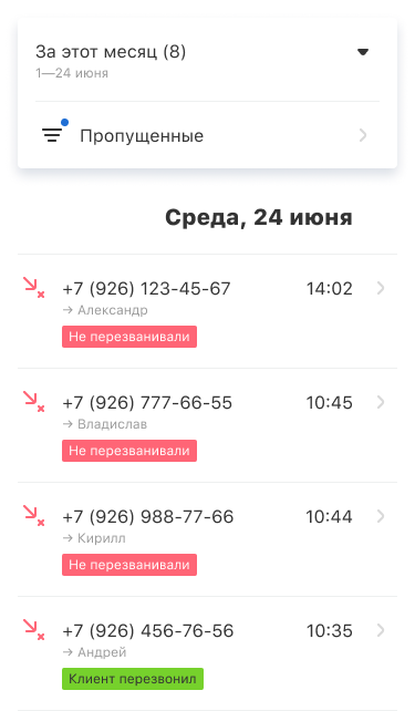 - включить push-уведомления о пропущенных, чтобы максимально быстро перезванивать клиентам;