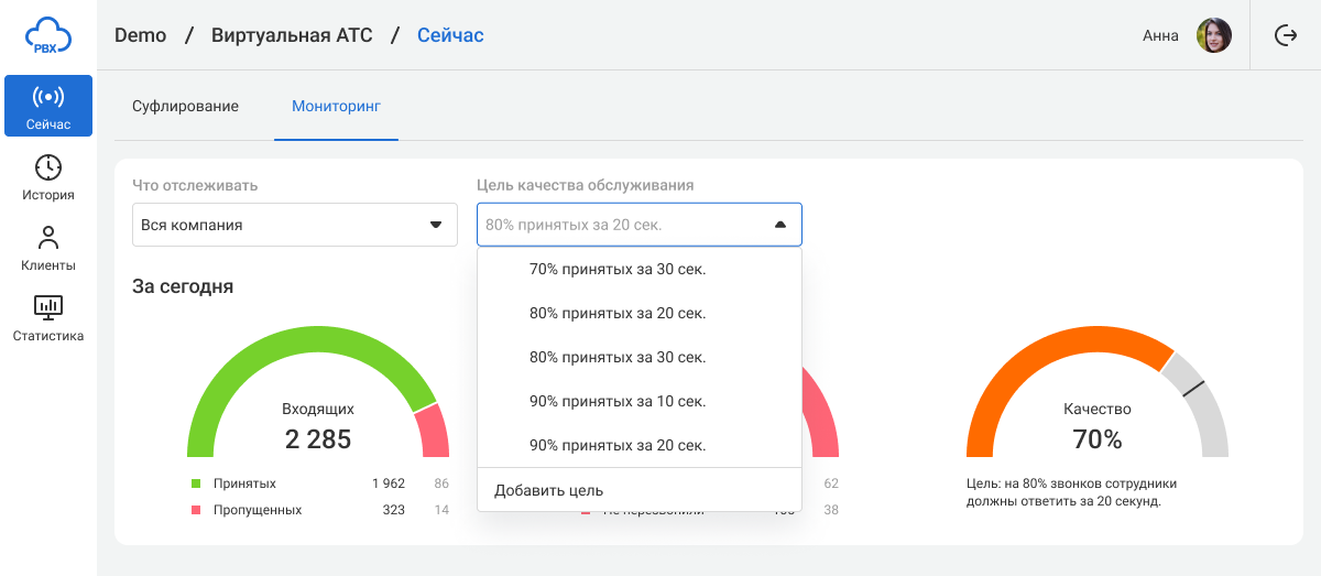 - Качество – доля входящих звонков, на которые сотрудники ответили в течение установленного времени (например, за 20 секунд).