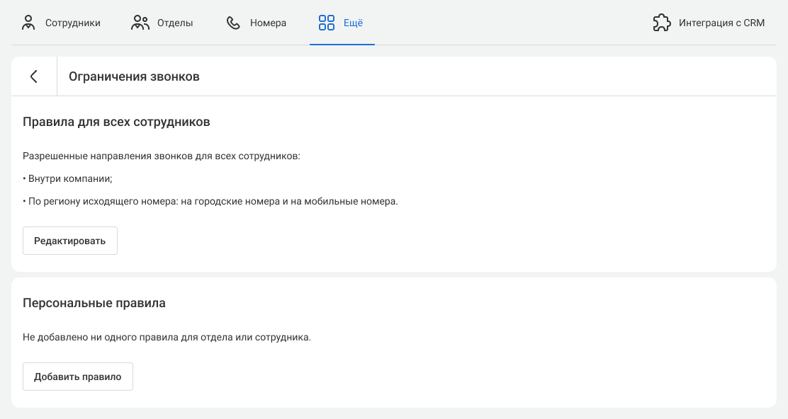 С помощью этих правил вы можете разрешить сотрудникам совершать звонки по определенным направлениям или запретить все исходящие вызовы, кроме внутренних и по региону номера.
