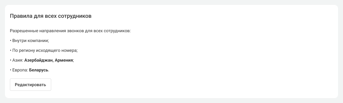 В целях безопасности вы можете ограничить для сотрудников возможность звонков в определенные регионы мира или России.