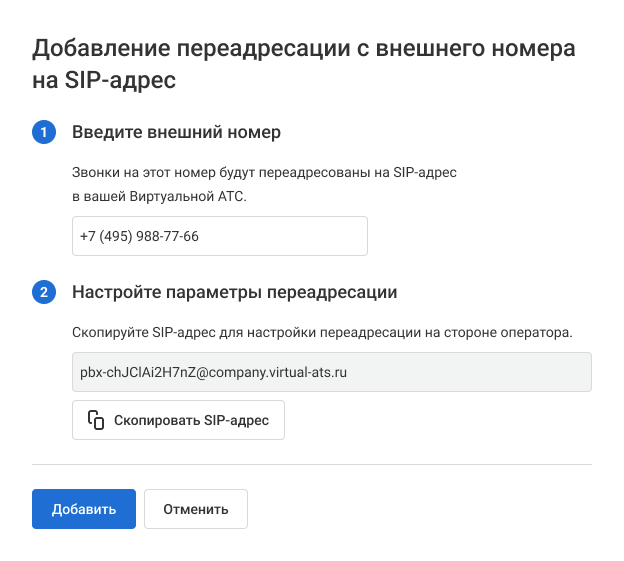 Функция предоставляется без дополнительной платы. Вы можете подключить до 30 внешних номеров. Для расширения лимита обратитесь в поддержку.