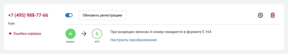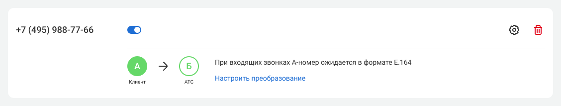 Также в настройках номера будет раздел «При входящих звонках А-номер ожидается в формате E.164». Это техническая информация и, чаще всего, сюда вносить изменения не требуется. Если ваш оператор связи работает не по стандарту E.164, здесь вы сможете настроить преобразование.